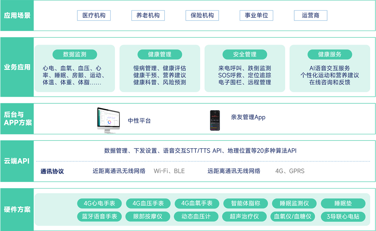 对血压、房颤、心率、心电等关键指标的全数据监控,可实现人体健康数据的采集、同步运算、实时传输、智能分析、异常预警、持久存储、三方共享。